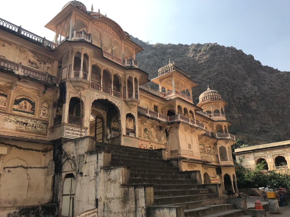 One of Hannah’s tick list items for the trip was to visit the Monkey Temple (also known as Galtaji). We were left at the entrance and made our way in accompanied by a very enthusiastic guide who lives within the temple. After buying the obligatory bag of nuts I could smell the monkeys before we saw them – the stench !!! The architecture is extremely impressive and is surrounded by a natural spring in which the people come to bathe in to wash their sins away and to obtain good energy. We were encouraged to wash our hands in the pool and told “clean hands; good energy”. Never mind the energy – I was regretting leaving the hand sanitiser in the car! Hannah loved the monkeys jumping on her shoulder and there was one which cuddled into her and wouldn’t get down. I declined the offer but one rather cheeky, if not arrogant!, monkey arrived uninvited on the top of my head! I screamed and squirmed and shouted for the blasted thing to get down but it was rather determined to stay put! As if my hair wasn’t a disaster enough with no hair dryer, I now had a smelly monkey pulling at my hair and making itself at home!! Hannah was nearly wetting herself with laughter and even the guide was amused.