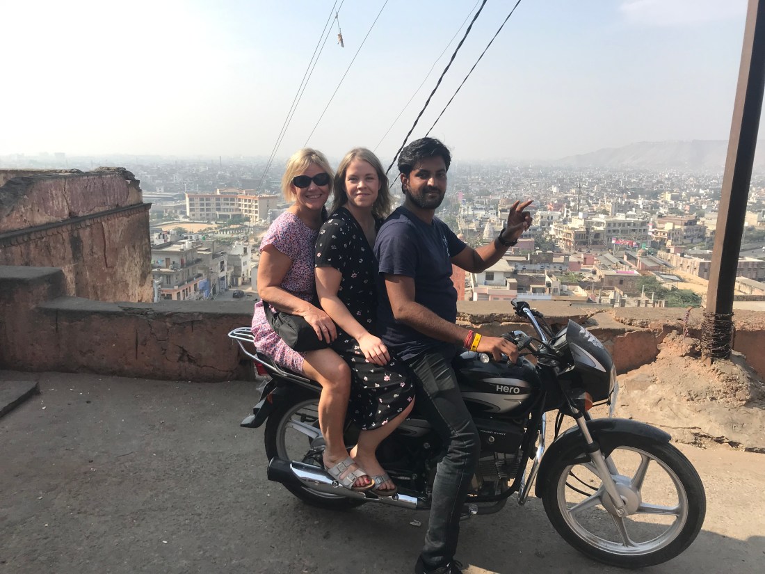 Our guide offered to take us 2 km up the hill to witness the fabulous hilltop view of Jaipur. I started to walk but I think he viewed me as a somewhat unfit bird who would not make the steep walk. I think it was either this or he wanted to impress Hannah as he said he would take us by motorbike !! Aged 52 and 9 months I have never been on the back of a motorbike! My girls have always been warned against them; John has even been denied the wish to own a motorbike – I loathe them! But hey, here I was agreeing to “jump on the back”. Hannah got on behind the guide and I clung on behind her. Laugh?!? Tears were rolling down our faces and, not for the first time during this trip, I thought I was going to die! Here – on top of the monkey temple in Jaipur, with dishevelled hair and not even wearing matching underwear – the shame!! I managed to get off the bike and the views were actually worth it – stunning. I limped around and tried to pull myself together concerned I had burnt my leg on the exhaust pipe – Note to my pharmacy friends; you didn’t send me prepared for exhaust burns; you are forgiven xx Another trip down the hillside with our guide shouting “are you ok Mam?” – “No” I yelled back “I am too far from home”. I dread to think what the monks thought as an Indian with 2 blond women on the back of a motorbike hurtled down the hillside with the one on the back screaming trying to hold together her dignity and pride. Another day of getting the dress code wrong – dresses and India do not go.